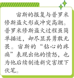 宙斯决定报复普罗米修斯,拒绝给予人类为实现文明所急需的最后的赠品——火。但机智的伊阿珀托斯的儿子却想出了办法加以补救。他拿了一根坚挺的大茴香枝,到天上去靠近从旁经过的太阳车,把这根木枝往那闪光的火焰里一杵,便得到了火种。他带着这个火种降到大地上,木堆燃烧的熊熊火光随即直冲云霄。当宙斯看见人间竟有照得如此遥远的火光升起时,他的灵魂深处感到钻心的疼痛。既然人类已经学会用火,他就不能从他们手中把火夺走了。他立刻想出一个新的灾害来。他要求因技艺高超而闻名遐迩的火神赫菲斯托斯为他造出一个美丽的少女形象。