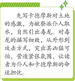 卡德摩斯满怀感激之情俯伏在异乡的土地上,亲吻这片土地。他想要向宙斯献祭,于是他就派仆人到活泉去取水用来举行神品饮的献礼。在那个地区有一个从未被采伐过的古老的树林。林中岩石犬牙交错,树木盘根错节。一个拱形的深谷里处处流淌着清凉的泉水。在这个洞穴里隐藏着一条凶龙,老远就可以看见红色的龙冠闪着亮光。它的眼睛喷射着火焰,它膨胀的身体里充满毒汁,它用三个舌头发出咝咝的声音,它嘴里长着三排锋利的牙齿。当腓尼基的仆人走进小树林时,淡青色的龙突然从洞里伸出头来,发出可怕的叫声。腓尼基的仆人一惊,汲水罐便从手中滑落下去,他们吓得全身血液都凝结了。毒龙把它遍布鳞甲的身躯盘成滑腻腻的一堆,蜷缩成直立的弓形,然后抬起半个身体,向下边的树林望去。突然,它狂怒地冲向腓尼基人,把他们咬死一部分,勒死一部分,剩下的则用它的毒气让他们窒息,或用它的毒涎杀戮。