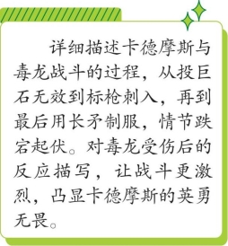 他一边说着,一边搬起一块巨石向毒龙投去。这样大的一块石头会砸得城墙和塔楼摇摇欲坠,但这条毒龙却一点也没受伤,它的坚硬的黑皮和鳞片像铁甲一样保护着它。现在英雄开始投掷标枪。这回怪物的身体顶不住了,钢制的枪尖深深地刺入它的脏腑。疼痛使毒龙勃然大怒,它回过头来咬碎枪杆,但枪头却牢牢地留在它的体内了。它被刺了一枪,就更加暴怒了,它的咽喉胀了起来,白色的泡沫从毒腭里往外喷吐。毒龙挺起比树干还直的身躯,像箭一样冲过来,但它的胸部撞在树干上了,鲜血终于从这头怪兽的脖子里流了出来,染红了周围的杂草。但伤势不重,毒龙仍能躲避冲刺砍杀。最后,卡德摩斯把长矛深深地捅进毒龙的咽喉,一直捅到一棵橡树里,把怪兽的脖颈钉在树干上,这时毒龙才被制服。
