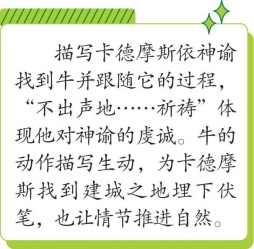 卡德摩斯刚刚离开阿波罗赐他神谕的卡斯塔利亚圣泉,便在一片绿茵茵的牧场上看见一头脖子上没有负轭痕迹的牛。他不出声地向阿波罗做着祈祷,慢步跟着这头牛走。他涉过克菲索斯的浅滩,又走了一大段路,那头牛忽然站住了,它把两耳对着天空竖起,空中立刻响起哞哞的叫声。然后它回头看了看跟它走来的那群人,最后就躺在青草里了。