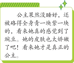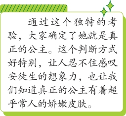 这样一来,大家都明白她才是一位真正的公主,因为隔了二十张厚床垫还有二十条羽绒被她依然可以感觉得到那颗豌豆。除了真正的公主,任何人都不会有这么娇嫩的皮肤的。现在王子知道了,他遇到了一位真正的公主。于是王子娶她为妻。
