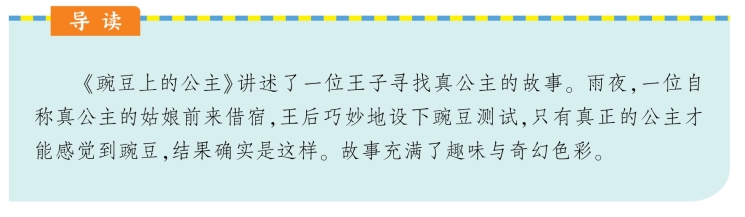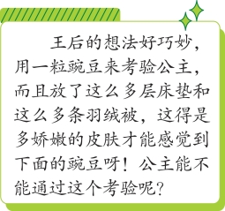“好吧,我们很快就会弄明白的。”年老的王后这么想着,但是她嘴上却一声不吭。她走进卧室,把床上的床垫等所有的卧具统统拿走,在床板上放了一颗豌豆。然后她拿来了二十张厚厚的床垫铺在床板上,又在这二十张厚床垫上铺上了二十条羽绒被。