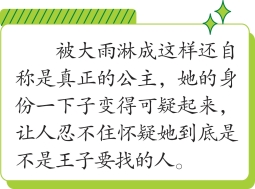 可是天哪,暴风雨把她弄成了一副什么模样!雨水顺着她的头发和衣裳哗哗地往下淌,从她的鞋帮里流进去,又从鞋跟里淌出来。她说自己是一位真正的公主。