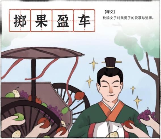 潘安的美,是从小美到大的。少年时的潘安随父亲一起搬到洛阳定居,他时常带着牛皮弹弓,乘车出门打鸟游乐。城中的妇人整日伺机而动,遇到潘安出来玩,就手拉手把他围起来,好好欣赏。有些妇人情难自禁,就将美味的水果往他车上丢,期望能引起他的注意。待到潘安突出重围的时候,车上已经装满了水果。虽然在古代没有娱乐圈一说,但潘安受到的这种待遇可丝毫不比现在的演员差,成语“掷果盈车”也由此而来。