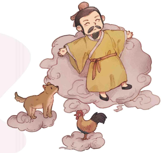 刘安马上按照方子炼起仙丹来,最后炼出了10颗。仙丹散发着七彩的光,一看就不同凡响。刘安很激动,一口气吞下5颗,还没等他吞下剩下的5颗,他就飘飘悠悠飞上天,得道成仙了!剩下的5颗仙丹从刘安的手里滚落到院子里,被鸡和犬抢着吃了。结果,这些鸡犬竟然也都飞上天成神仙了。