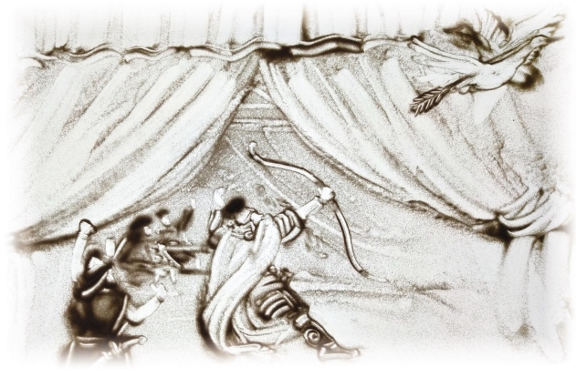 长孙晟只拿了一支箭,拉开弓箭,射向天空。只听“嗖”的一声,两只大雕同时落地。