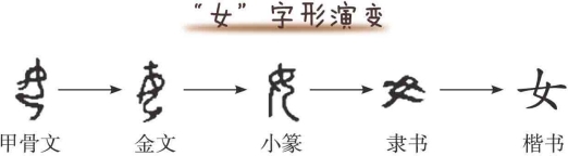 “女”的甲骨文写作 ,字形像一个屈膝跪坐的人 安静地交叠着双手 ,突出了女子温顺听话的特点。