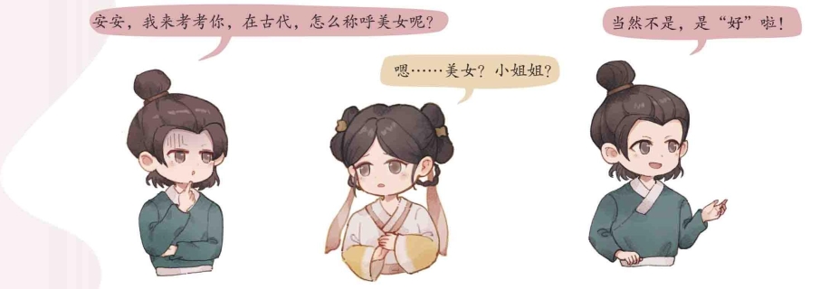 历史上有很多美貌的女子,最有名的是被称为“沉鱼落雁,闭月羞花”的四大美女。在甲骨文中,美貌的女子是 (好)。“好”引申为优点多,或者是喜爱。还有一个字也是用来形容美女的——“娃”。“娃”的篆文写作 ,左边是 (女),右边是圭(圭),是一种长条状的珍贵玉器。古人认为吴地美丽的女子较多,把吴地的女子称作“吴娃”。宫中美丽的女子被称作“宫娃”。后来,“娃”引申为小孩子或者幼小的动物。“小娃”就是小孩子。