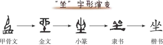 “坐”的甲骨文写作 ,像是一个人 跪坐在垫子或者席子 上,造字本义是跪坐。古代没有凳子,人们都是盘腿跪坐在席子上,成语“席地而坐”因此而来。