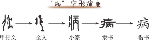 “病”的甲骨文写作 ,字形表示一个人 躺在床上 大汗淋漓 。是不是很像我们发烧生病的样子?篆文 变形较大,加入 表示读音。简化后,把 写成疒,便有了今天的字形“病”。