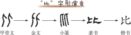 “比”的甲骨文写作 ,字形与“从”相似,只是两个人面部朝向的方向不同。“比”像两个人并肩而立,造字本义指两个人并肩挨着,引申为比较、较量,如“比赛”。