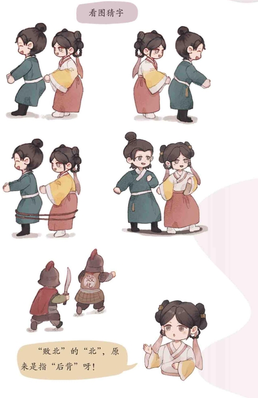 “北”的甲骨文写作 ,两个人背靠背,表示相反、违背、违反的意思。后来, 被借去表示北方,篆文 ,加 (肉),另造“背”来表示本义。古人把打败仗称作“败北”,并不是指失败了以后朝着北边逃跑,而是说打仗的时候敌我双方是面对面的,失败逃跑的时候,就会把身子转过去,朝着和战场相反的方向跑去。