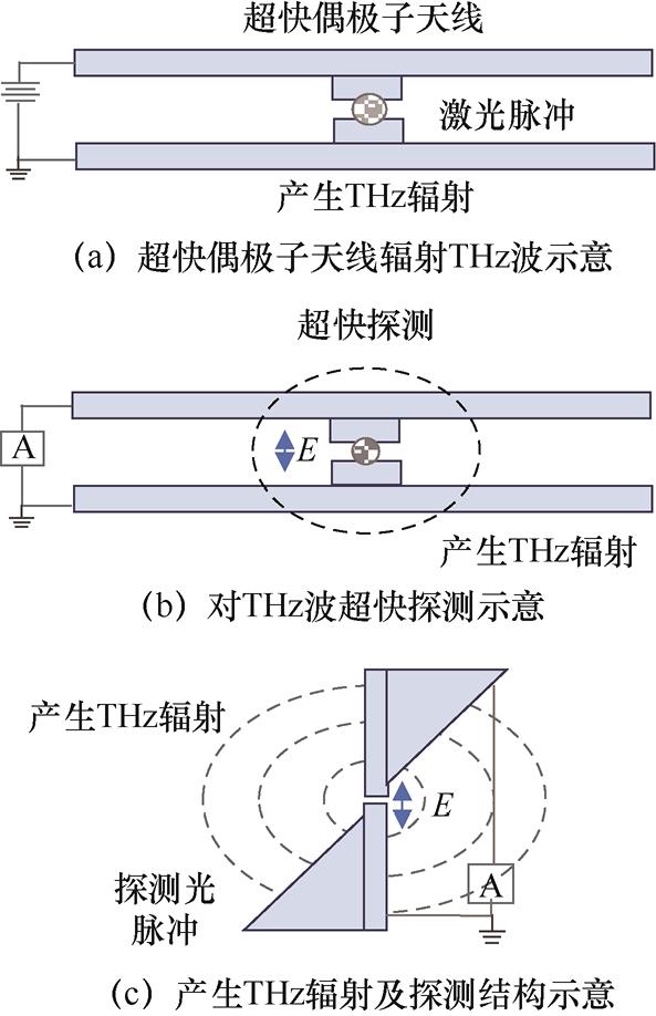 THz波产生之后,寻找稳定、有效的探测方法就成为首要任务。在THz发射光谱发展的整个历程中,人们研究出了一系列的探测方法。最先使用光电导天线,主要制作材料是低温生长的GaAs和Si-GaAs。1989年,Grischkowsky教授等人首次利用半导体光电导天线在同一系统中实现了对THz波的发射与探测 [6] 。他们采用了一种新型的电偶极子天线结构,如图1.3所示。该天线结构设计的独特之处在于,将探测到的光电流引入天线臂中,与传统的末端偶极子天线相比,该天线的探测性能得到了显著提升,主要体现在将5 μm间隙中的总光电流注入30 μm的天线中。具体来说,该实验使用了两种不同的天线结构来探测产生的THz波,发射器与探测器相隔80 cm。探测过程中,天线受到平行入射的THz电场的驱动,在天线间隙产生随时间变化的电压。这种感应电压驱动了光生载流子,将探测光脉冲产生的电荷流与THz波和探测光脉冲之间的时延进行收集,从而获取了THz波的时域波形信号。THz波经过80 cm的自由空间传播后,通过扫描延迟线进行探测。产生的THz波在进入探测器前经过准直与聚焦,以提升发射器与探测器之间的耦合度,从而为高灵敏度的THz波探测奠定了基础。这一工作的成功不仅为后来的THz时域光谱系统的建立奠定了基础,该天线结构也成为目前常用的THz时域光谱仪的原型之一。