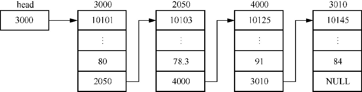 在链式存储结构中,逻辑上相邻的数据元素可以存储在物理位置不相邻的存储单元上,如图1.8所示。也就是说不同的数据元素可以存储在连续的地址空间,也可以存储在不连续的地址空间。通常情况下,在高级程序设计语言中可以用指针类型来实现链式存储中对逻辑关系的描述。