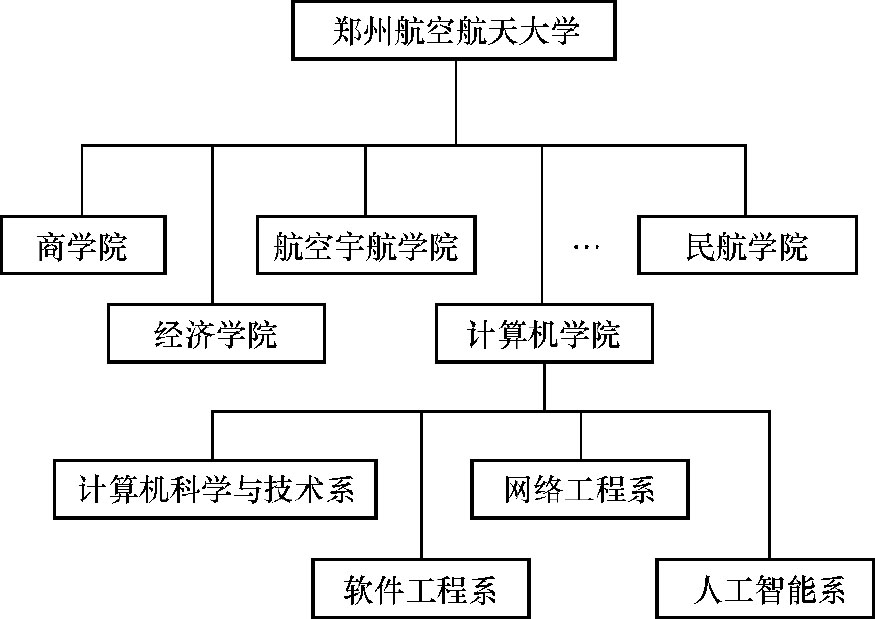 在实际应用中,一所学校的组织架构类似于树形结构,如图1.4所示。树根为学校,学校的下一层对应各个学院,各学院下有各个系。因此,学校架构可被抽象成树形结构来进行数据管理。