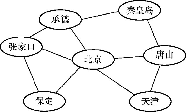 航空公司的飞行线路图类似于上述结构,如图1.6所示。每一个城市都是一个数据元素,飞行线路是元素之间的关系,一个城市机场可与多个城市通过飞行线路相连,多个城市连接成网状。