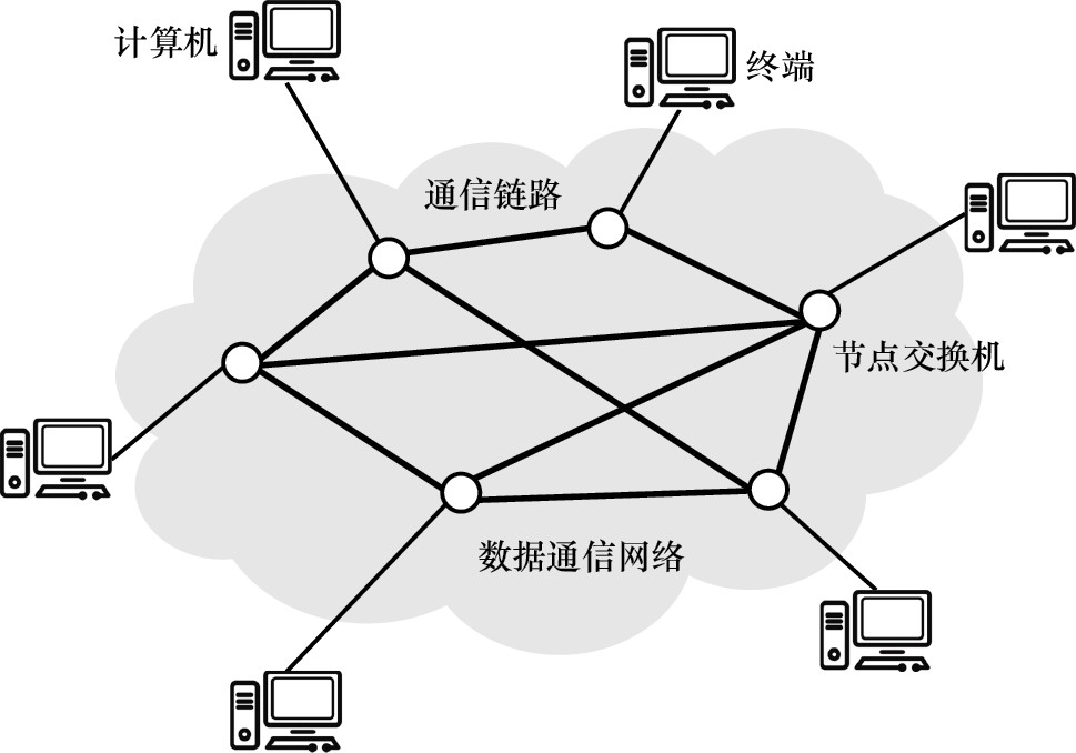解决上述问题的有效办法是将所有设备都连接到一个通信网络上,如图1-5所示。这个数据通信网络由一些处于不同地理位置的数据传输设备(如计算机和终端)、数据交换设备(如节点交换机)及通信链路等构成,其作用是使网络上任意两个节点之间都能正确、快速地传送和交换数据。