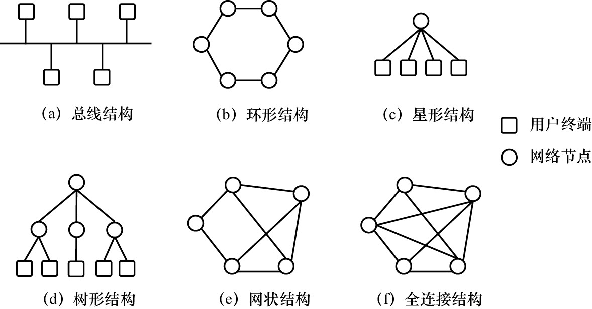 在实际组网中,数据通信网络可以根据需要形成多种拓扑结构,典型的拓扑结构有总线结构、环形结构、星形结构、树形结构、网状结构、全连接结构等。如图1-6所示。