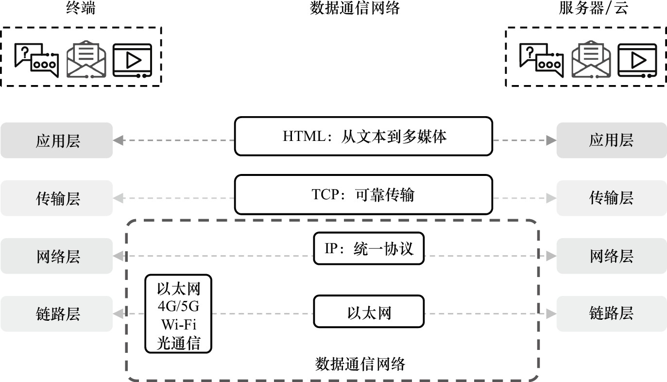 数据通信网络以分组交换为技术基石,以计算机互连为根本需求,一端连着手机、计算机等终端设备,另一端连着服务器和云,在数字世界里提供“物流服务”,如图1-7所示。其中,以太网和TCP/IP是构建数据通信网络的基础。