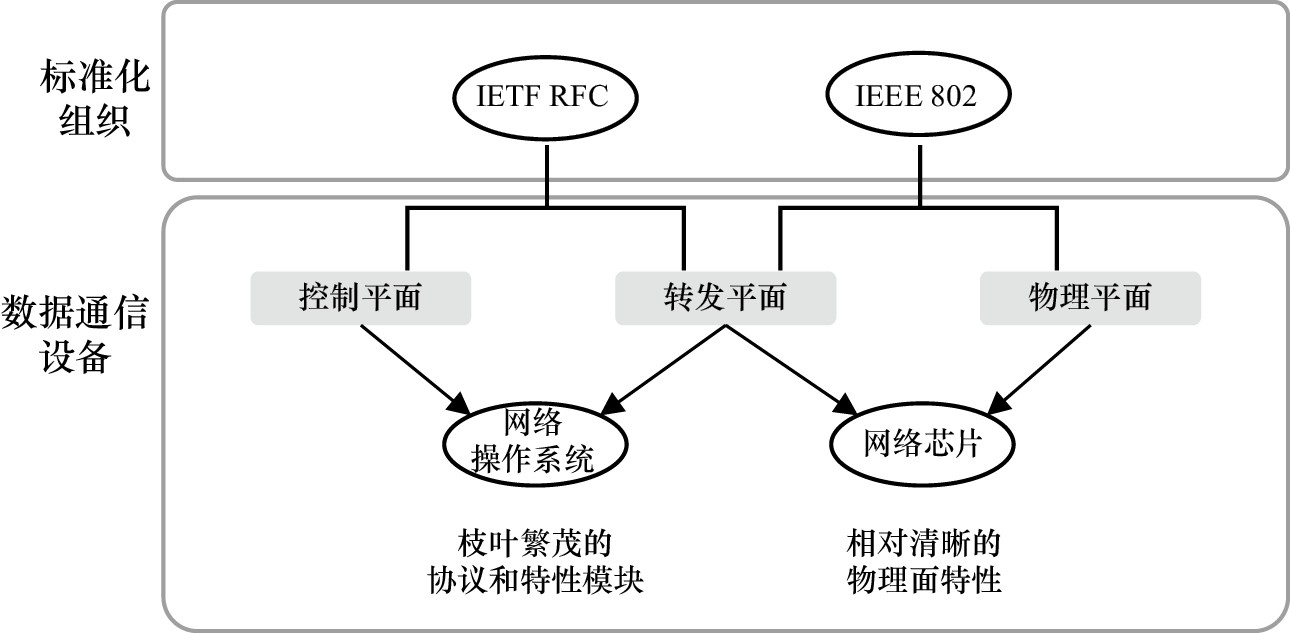 数据通信产业有两个非常知名的标准化组织—IETF和IEEE。IETF发布了一系列征求意见稿(Request for Comments,RFC),主要覆盖数据通信的控制平面和转发平面,定义IP、MPLS等各种协议和特性,是网络工程师和开发者开展工作的重要参考资料。IEEE802委员会制定的802标准族主要覆盖数据通信的物理平面,定义数据通信的物理接口标准,例如无线保真(Wireless Fidelity,Wi-Fi)5标准、Wi-Fi 6标准、GE接口标准、10GE接口标准等。这两个标准化组织和数据通信设备的关系如图1-19所示。