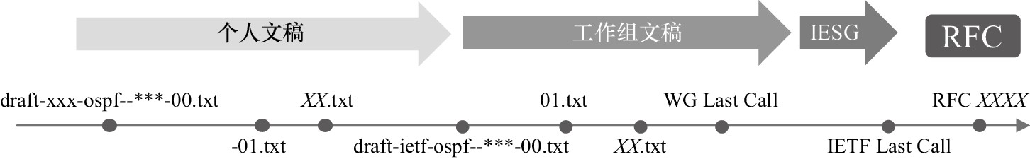 IETF的工作组会议和邮件讨论组可能是世界上最具学术氛围和民主氛围的团体之一,他们每天都进行技术讨论。RFC的产生需要经历图1-20所示的3个阶段。首先在已有的工作组内提交个人文稿(Individual Draft),也被称为Internet Draft。任何人均可以提交个人文稿,而且任何人都可以对文稿进行评价,哪怕文稿的提出人是权威人士。个人文稿提交后需要经过多次讨论、沟通,最终被工作组接纳,形成工作组文稿(WG Draft)。工作组对工作组文稿进行多次讨论、修改,达成共识后发起工作组Last Call(将最终草案提交给全体成员进行评论,通常持续两周时间),并提交给因特网工程指导组(Internet Engineering Steering Group,IESG)。IESG评估并发起IETF范围内的Last Call,达成共识后由RFC Editor负责编辑、出版,最终发布成为正式的RFC。