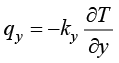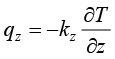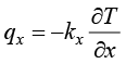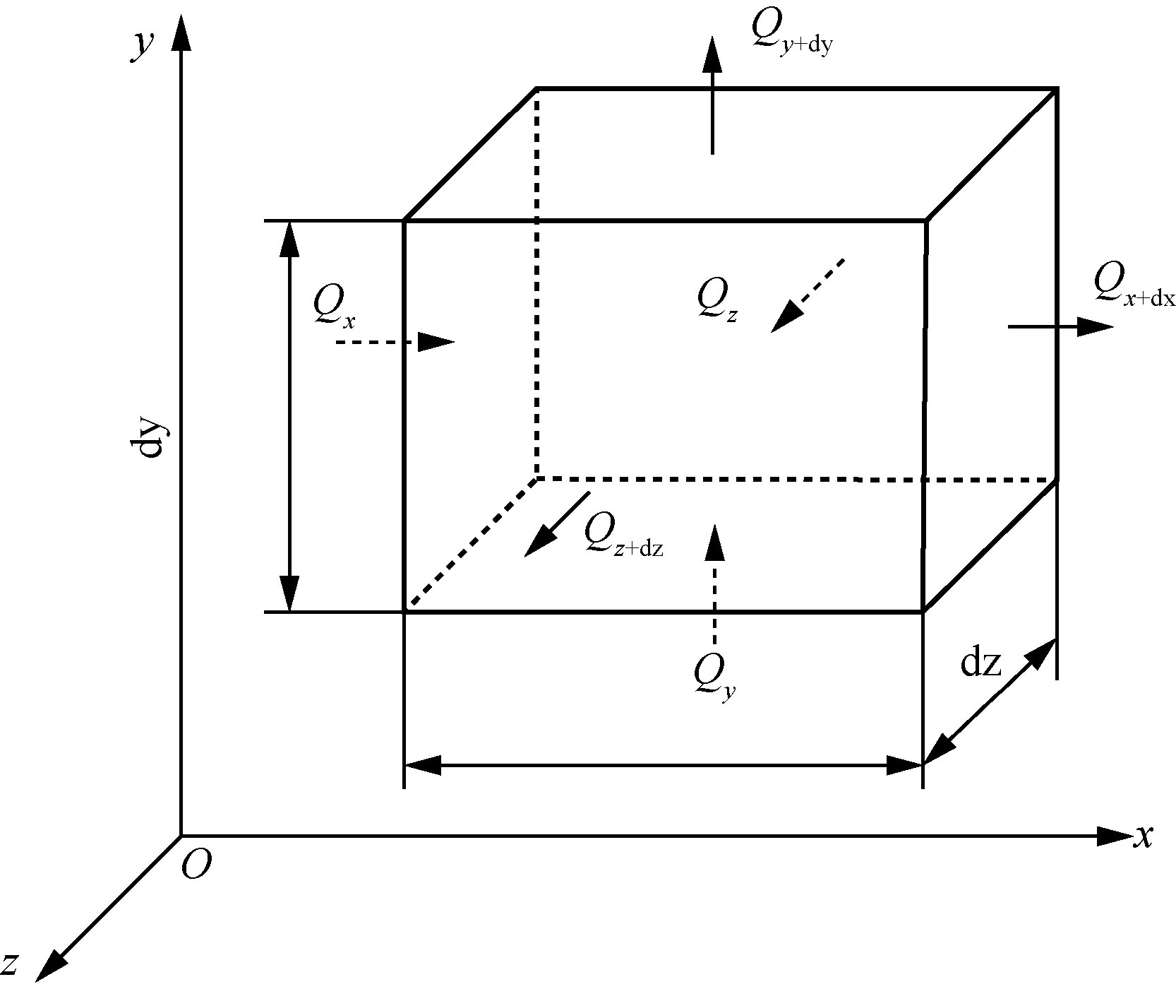 傅里叶方程中的负号表示热传导过程服从热力学第二定律,热量从高温区域流向低温区域。通常在笛卡儿直角坐标系中研究热力学系统的状态变化,由傅里叶方程(1.9)可得到 x 、 y 、 z 这3个坐标轴方向的热流密度: