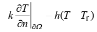第三类换热边界条件表明固体边界热流密度与固体和流体之间的温度差成正比,实质上是Robin条件的一种表现形式。一般情况下,流体温度和换热系数设置为常数,特殊情况下可以是温度、时间与位置的某种函数。换热系数与流体物性、流动速度、流体和固体之间的温差等因素相关,多数情况下需要采用实验方法测定。需注意的是,式(1.34)表示热量从固体向外流出传递到流体中;当热量从流体介质流入固体时此公式仍然正确。