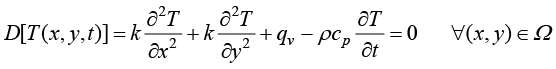 本节采用加权余量法推导平面热传导问题的有限元模型。根据式(1.18)得到平面热传导控制方程的微分形式为