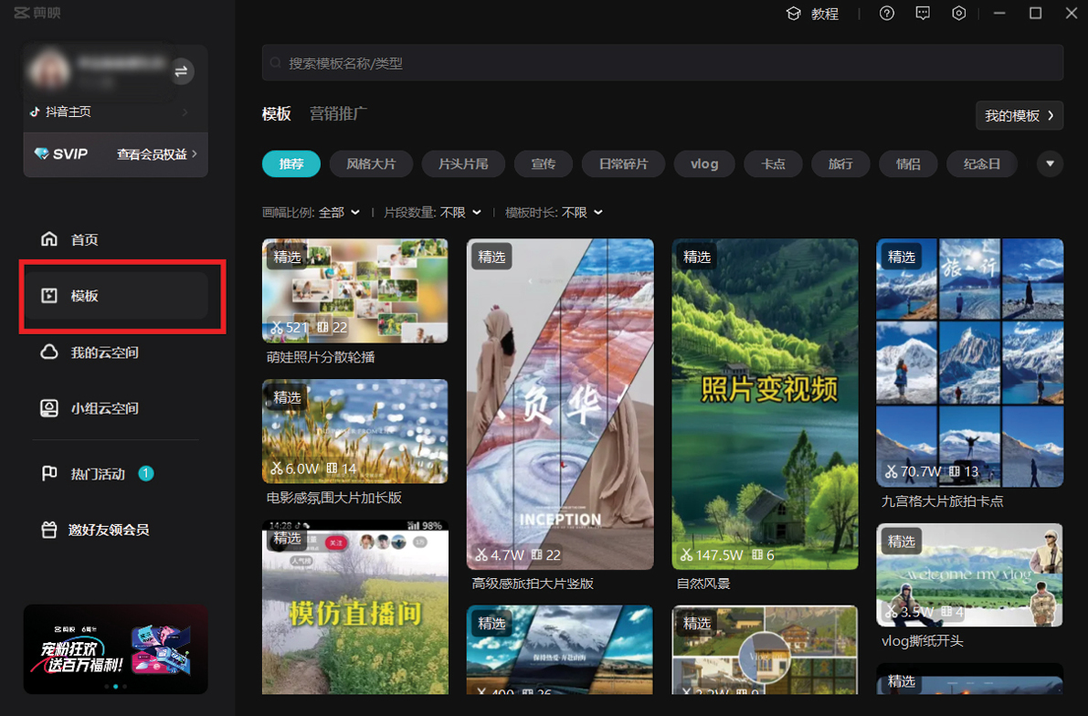 单击左边导航的“模板”按钮 ,就进入模板界面,如图1-20所示。我们可以看到剪映专业版也提供了大量不同类型的模板,创作者可以根据需要选择合适的模板直接套用。