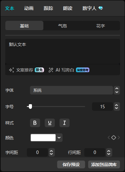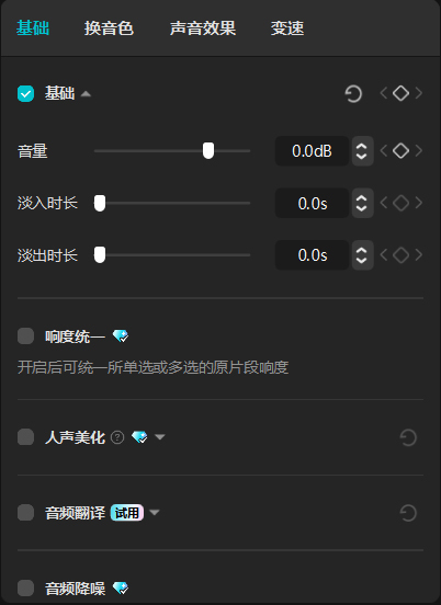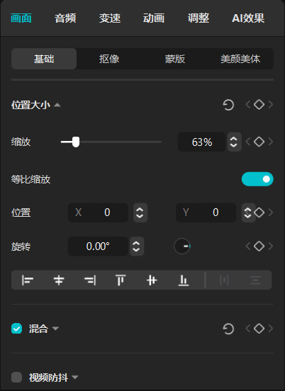 选中时间轴中的某段素材后,可以在属性区中调整该素材的属性参数。选中视频、文字、音频素材后,属性区显示的界面分别如图1-25至图1-27所示。