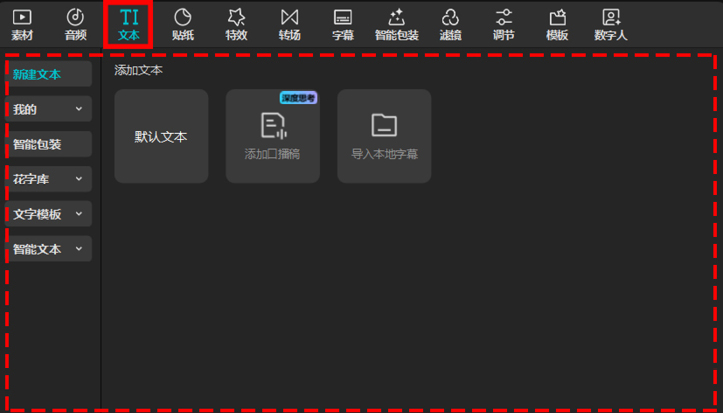选择工具栏中的不同选项,素材区会切换至相应的界面,可供用户进行视频、文字、音效等内容的导入或创建,如图1-23所示。