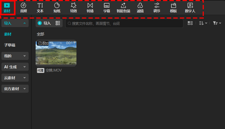 工具栏位于界面左上方,包含素材导入、音频、文本添加、贴纸、特效、转场、字幕、智能包装、滤镜、调节、模板、数字人等核心功能入口。选择“素材”选项后,可以将素材导入素材库,如图1-22所示。