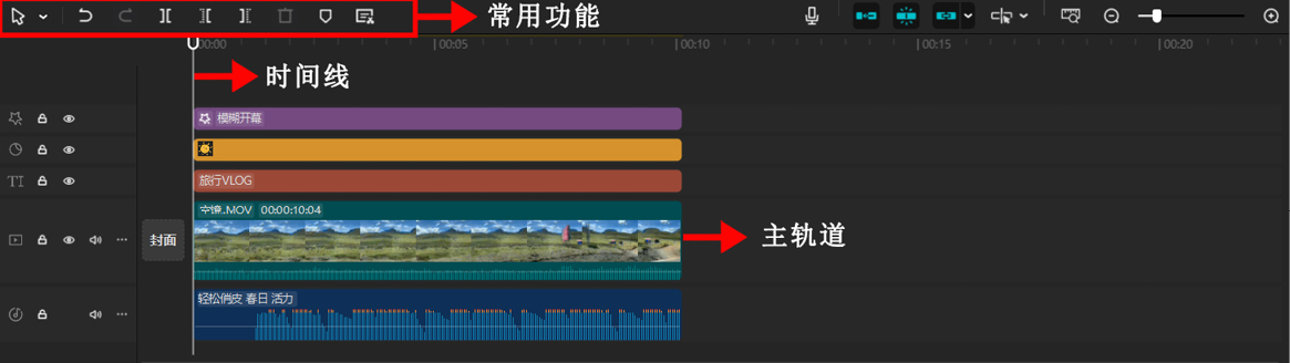 剪映专业版时间轴支持多轨道分层编辑,多段视频素材、音频、文本、贴纸等都可以同时显示在时间轴中,如图1-28所示。而剪映App通常只显示主轨道,如果要实现多段视频同时分屏显示,只能靠画中画的功能实现。相比剪映App适用于碎片化剪辑,剪映专业版能够提高剪辑效率,适合专业级创作。