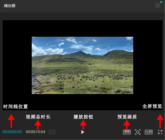 预览区占据界面中央区域,实时显示视频剪辑效果。我们可以用快捷键Ctrl+鼠标滚轮,快速地调整画面显示的比例,其他详细的功能如图1-24所示。
