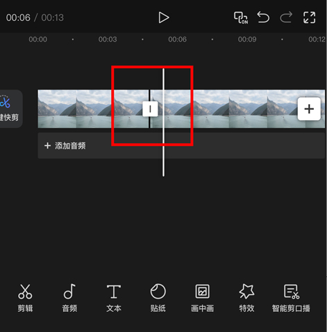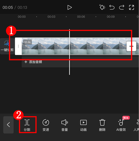 添加完素材以后,就需要对素材进行剪辑,截选出需要的部分。在操作界面,用手指滑动轨道,将时间线定位到需要剪切的地方,选中该段素材,单击底部工具栏中的“分割”按钮 ,即可将素材一分为二,如图3-11和图3-12所示。