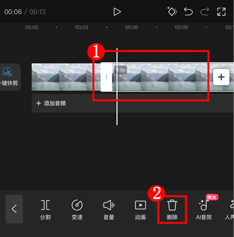 在轨道上选中某段多余的素材,单击底部工具栏中的“删除”按钮 ,即可将选中的素材删除,如图3-13所示。