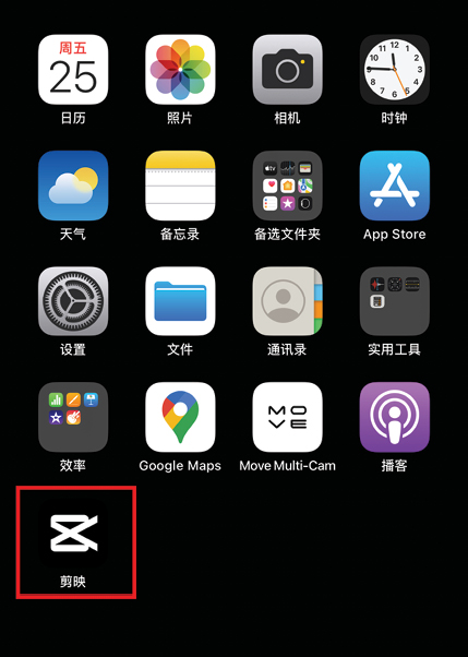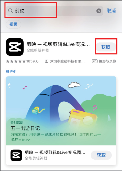打开手机,在手机桌面单击“App Store”图标,如图1-3所示。进入App Store后,在顶部搜索栏中输入“剪映”,在搜索结果中找到剪映App,单击“获取”按钮下载,如图1-4所示。安装完成后桌面会显示剪映图标,如图1-5所示。
