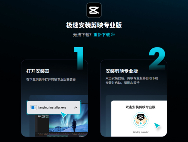 随即跳转至下载页面,页面中提示了安装步骤,剪映专业版安装器也同时自动下载到计算机中,如图1-8所示。在下载列表中双击剪映专业版安装器,即可自动安装,创作者还可以自定义安装路径,如图1-9所示。