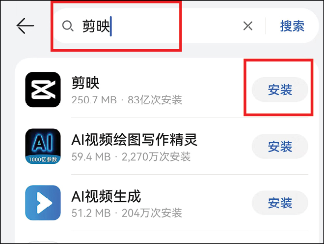 打开手机,在手机桌面单击“应用市场”图标,如图1-1所示。进入应用市场后,在顶部搜索栏中输入“剪映”,在搜索结果中找到剪映App,单击“安装”按钮并等待安装完成,如图1-2所示。