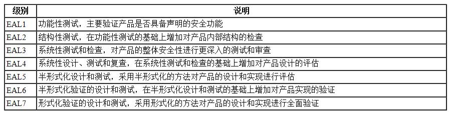 CC还引入了评估保障级别(Evaluation Assurance level,EAL)的概念,用于表示对产品进行评估的深度和严格程度。EAL级别分为EAL1~EAL7,级别越高表示评估越严格,产品的安全性能越可靠,如表1-2所示。