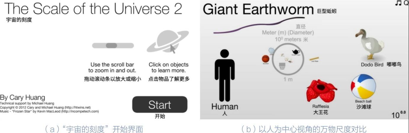 “宇宙的刻度”(The Scale of the Universe)信息交互系统(图0-3)以可视化和互动方式展示了自然界中各种不同尺度的物体和现象。用户通过对滚动条的拖动来放大或缩小视图,查看从原子尺度到超星系团尺度的各种物体。滚动条从人类尺度(1.7m)开始,向外(右向拖动)可探索到月球、恒星、星系和星系团,向内(左向拖动)可探索到微生物、分子、原子和亚原子粒子;每个尺度上的物体都有相应的信息和解释(如大小、发现历史等),帮助用户更好地理解和记忆物体的特征和重要性。