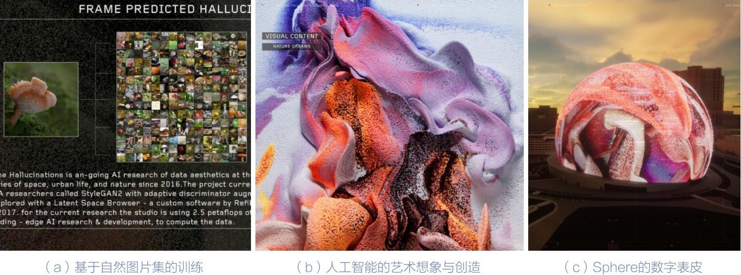 当代艺术与设计的边界日趋模糊,新的艺术或设计概念不断涌现,如批判性设计(Critical Design)、思辨设计(Speculative Design)、生物设计(Bio Design)、食品设计(Food Design)等。艺术家们反思设计的先入为主,对现有技术潜力进行理性思考,推测事物在未来社会的可能性或可能的社会形态。“机器幻觉:球体”(Machine Hallucinations:Sphere)信息交互艺术(图0-2)探索数据叙事美学,让人工智能与人类意识合作,为全球最大的球幕建筑Sphere设计了一个涌现性的数字表皮。艺术家选取大量自然生物图片训练出相关AI模型,再由人工智能通过算法自由想象与发挥,源源不断地生成艺术形式与数字内容。