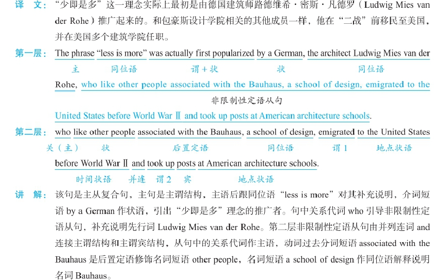5. The phrase“less is more”was actually first popularized by a German, the architect Ludwig Mies van der Rohe, who like other people associated with the Bauhaus, a school of design, emigrated to the United States before World War Ⅱ and took up posts at American architecture schools.