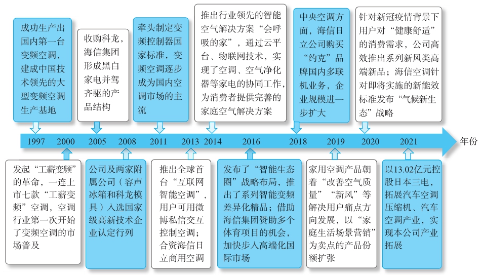 海信空调成立于1996年,是中国最早致力于变频空调研发、生产和推广普及的企业,是集空调技术研发、生产制造、市场销售、技术服务于一体的专业化企业。公司多年来始终坚持“技术立企”,利用沉淀的技术优势,推进技术的迭代升级。截至2020年,已取得国家级、省级、市级科研成果超过3000项,年产能1200万套以上,产品远销全球130多个国家和地区。图1-1展示了海信空调发展大事记。从产品和技术层面看,海信空调的发展历程主要分为两大阶段: