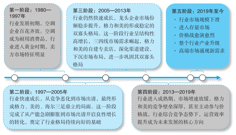 我国空调行业发展30年来,龙头企业居多,先后经历了五个发展阶段(见图1-2)。