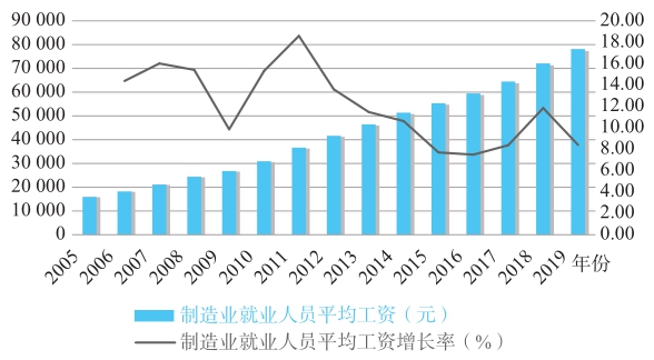 图1-5 2005-2019年我国制造业就业人员平均工资与增长率