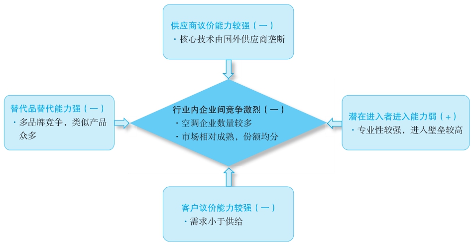2008年,行业内各企业由产能竞争转向专利竞争。随着空调能效等级标准不断提升,各大空调企业纷纷进行专利研发,构建产品壁垒,抢占市场份额。企业通过使用波特五力模型,对行业竞争现状进行分析,如图1-4所示(“+”代表对企业有利,“-”代表对企业不利)。空调行业竞争激烈,空调企业品牌众多,行业逐步形成了格力、美的、海尔三足鼎立的较为稳定的市场格局,而奥克斯、华凌、TCL、长虹等强势品牌也占据了一定的市场份额。“三超多强”的行业竞争环境使得空调企业的客户议价能力较弱,因此空调企业间频繁爆发价格战,以占领市场。