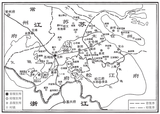 最后,有必要对本书所提及的“市镇”这一概念作些必要的交代。书中“市镇”一词,原则上不涉及府城、县城之类的行政治所,专指介于行政治所和农村聚落之间的商业市镇,即明清时期文献中被称作“市”或者“镇”的居民点,人口比单个的村子多,但在讨论具体问题时,则视情况而定。这是因为江南地区行政治所、商业市镇和农村聚落三者间的边界往往模糊不清。市镇虽然在某种程度上与农村拉开了距离,可农村居民常常是农、工、商多种职业兼营,并非只是种田的“专业农民”,相反,在市镇居民中,也有不少把其全部或部分劳动时间用于农业生产活动。由于工农之间界限模糊,江南出现了农村居民和市镇居民在职业与居所两方面的不一致。