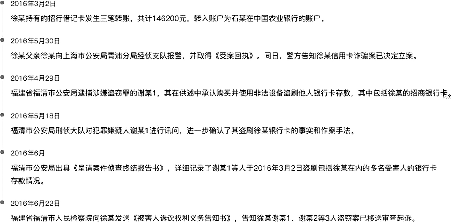 徐某是招商银行上海延西支行储户借记卡的持卡人,犯罪分子谢某1通过9800元人民币购买的设备,非法获取徐某的身份信息、手机号码、取款密码等账户信息后,通过补办手机SIM卡截获招商银行延西支行发送的动态验证码,进而进行转账,导致徐某涉案账户的资金损失。徐某在发现银行卡内资金被盗后,于2016年5月30日向上海市公安局青浦分局经侦支队报警,警方介入调查后,查明了犯罪分子的身份和作案手法。2016年4月底,福建警方逮捕了涉嫌盗窃罪的谢某1,之后,徐某向法院提起诉讼,请求招商银行延西支行赔偿银行卡盗刷损失及利息。