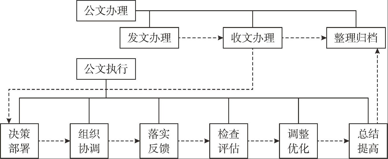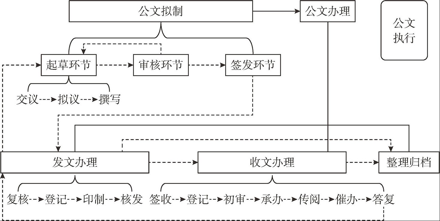 在党政机关日常工作中,公文拟制、办理结束后,就相对比较集中地完成了一项工作。在2012版《条例》中,公文处理工作流程主要包括公文拟制、公文办理两大部分。我认为,公文执行也是公文处理工作流程的重要组成部分。所以,下面主要是对“公文拟制、办理、执行”的流程进行分析,而将相对比较分散又具有全面渗透性的“公文管理”单列一节进行分析。